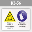 Знак «Опасно - едкие и коррозийные вещества. Работать в защитных перчатках», КЗ-36 (металл, 400х300 мм)