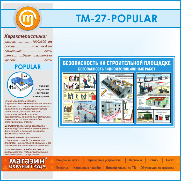 Стенд «Безопасность на строительной площадке. Безопасность гидроизоляционных работ» (TM-27-POPULAR) в Москве купить