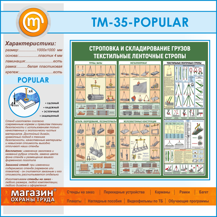 Стенд «Строповка и складирование грузов. Текстильные ленточные стропы» (TM-35-POPULAR) в Москве купить
