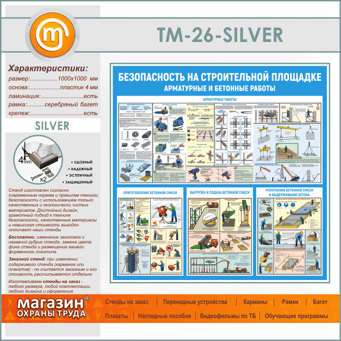 Стенд «Безопасность на строительной площадке. Арматурные и бетонные работы» (TM-26-SILVER) в Москве купить