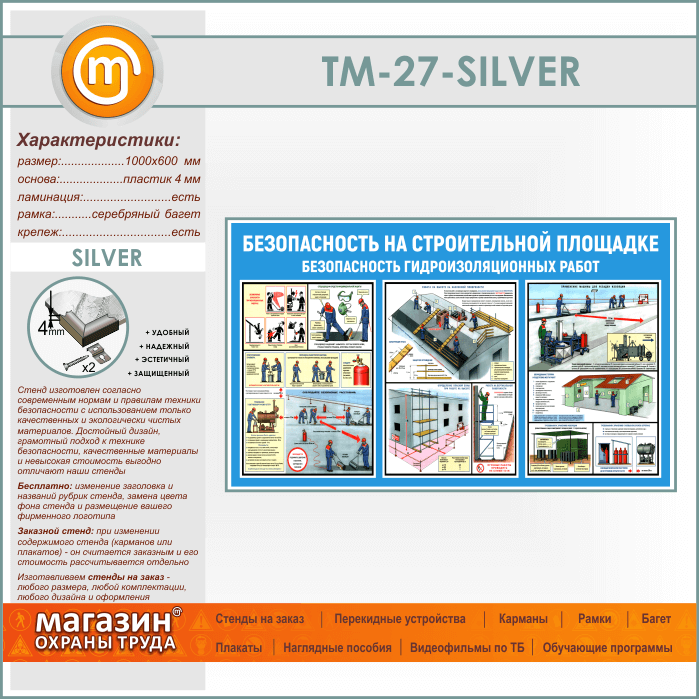 Стенд «Безопасность на строительной площадке. Безопасность гидроизоляционных работ» (TM-27-SILVER) в Москве купить