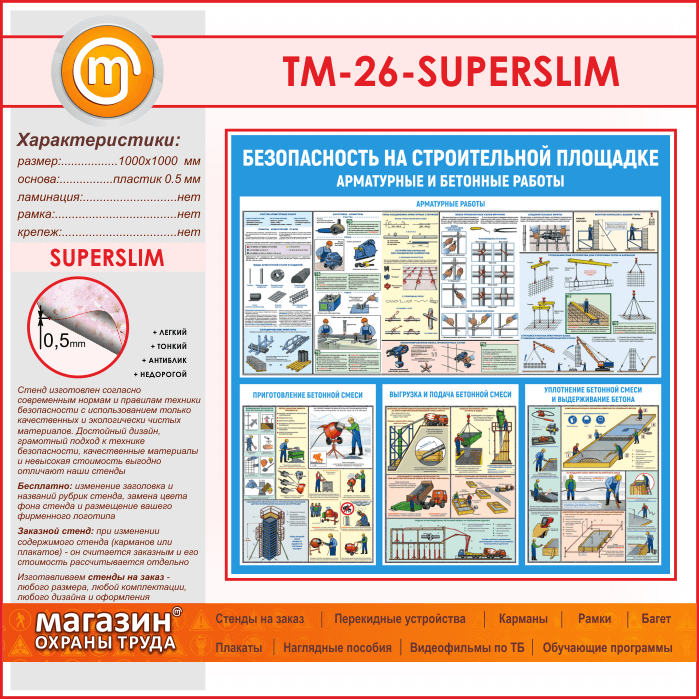 Стенд «Безопасность на строительной площадке. Арматурные и бетонные работы» (TM-26-SUPERSLIM) в Москве купить