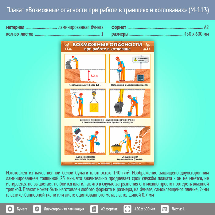 Плакат «Возможные опасности при работе в траншеях и котлованах» (М-113, ламинированная бумага, А2, 1 лист) в Москве купить
