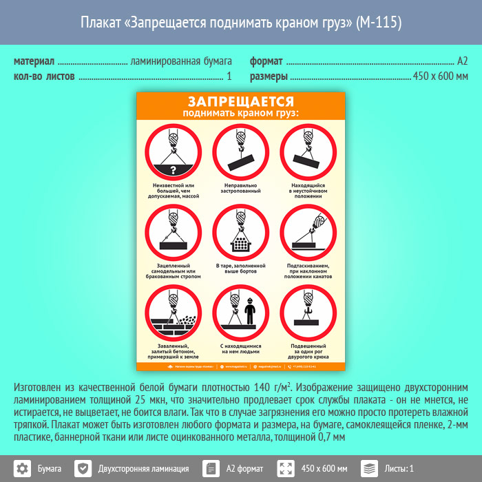 Плакат «Запрещается поднимать краном груз» (М-115, ламинированная бумага, А2, 1 лист) в Москве купить