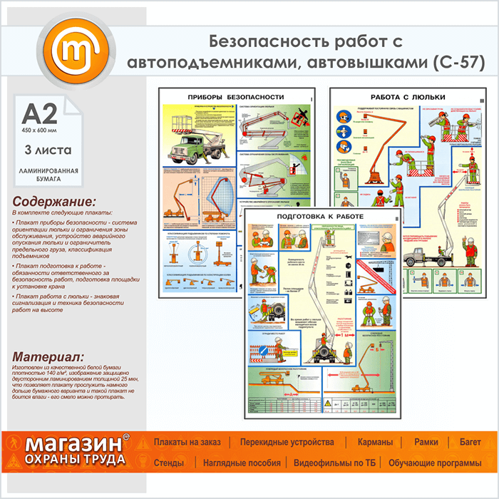 Плакаты «Безопасность работ с автоподъемниками, автовышками» (С-57, ламинированная бумага, А2, 3 листа) в Москве купить