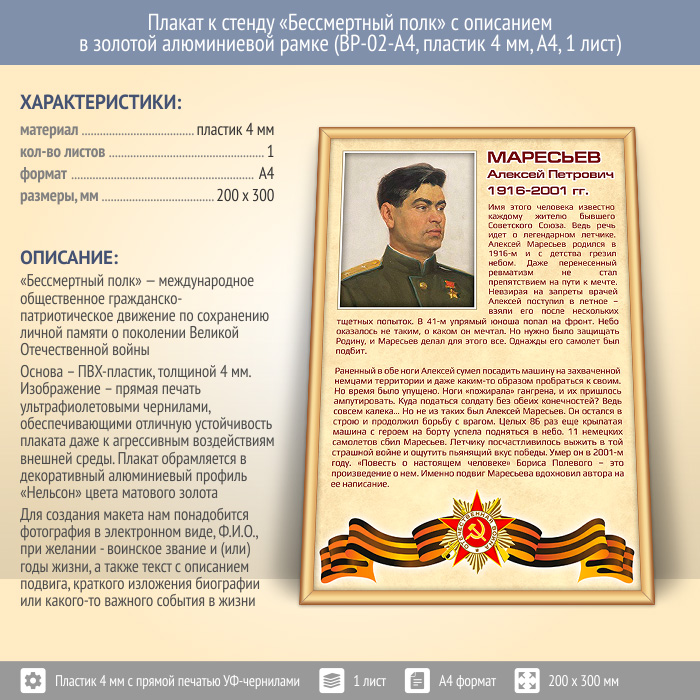 Плакат к стенду «Бессмертный полк» с описанием в золотой (матовой) алюминиевой рамке (BP-02-A4, пластик 4 мм, А4, 1 лист) в Москве купить