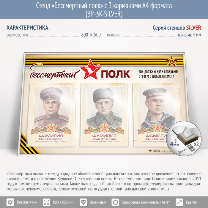 Стенд «Бессмертный полк» с 3 карманами А4 формата (BP-3K-SILVER) в Москве купить