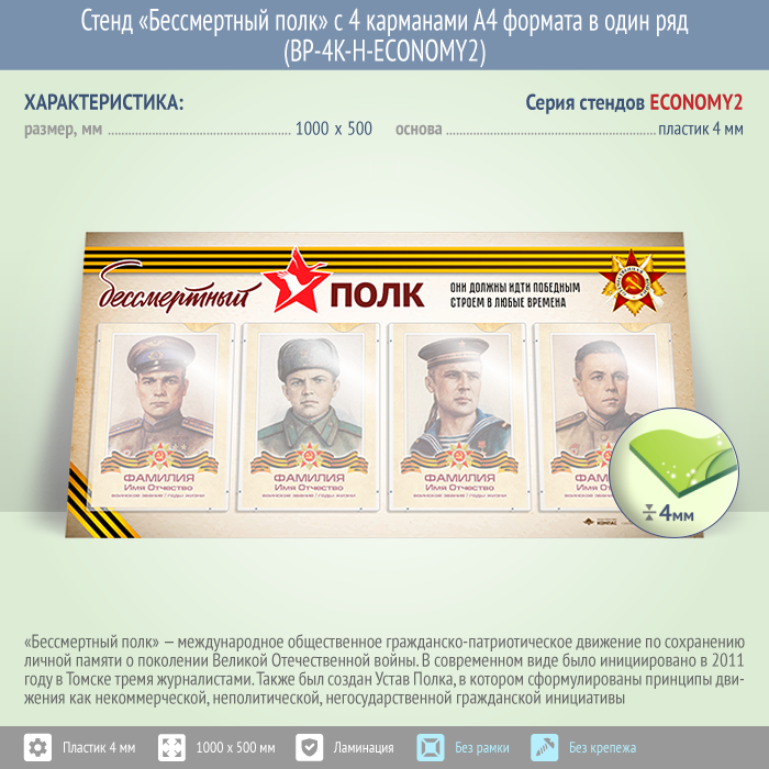 Стенд «Бессмертный полк» с 4 карманами А4 формата в один ряд (BP-4K-H-ECONOMY2) в Москве купить