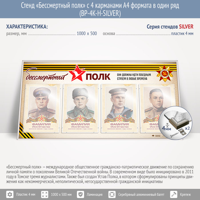 Стенд «Бессмертный полк» с 4 карманами А4 формата в один ряд (BP-4K-H-SILVER) в Москве купить