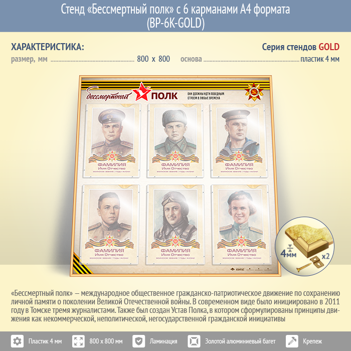 Стенд «Бессмертный полк» с 6 карманами А4 формата (BP-6K-GOLD) в Москве купить