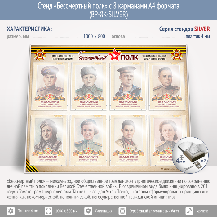 Стенд «Бессмертный полк» с 8 карманами А4 формата (BP-8K-SILVER) в Москве купить