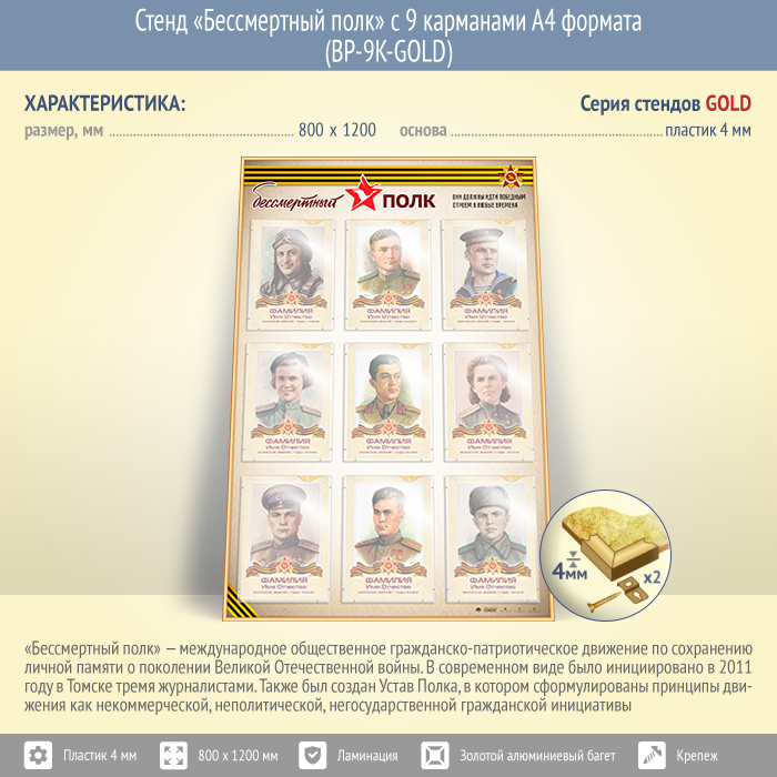 Стенд «Бессмертный полк» с 9 карманами А4 формата (BP-9K-GOLD) в Москве купить