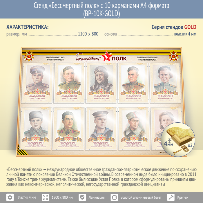 Стенд «Бессмертный полк» с 10 карманами А4 формата (BP-10K-GOLD) в Москве купить