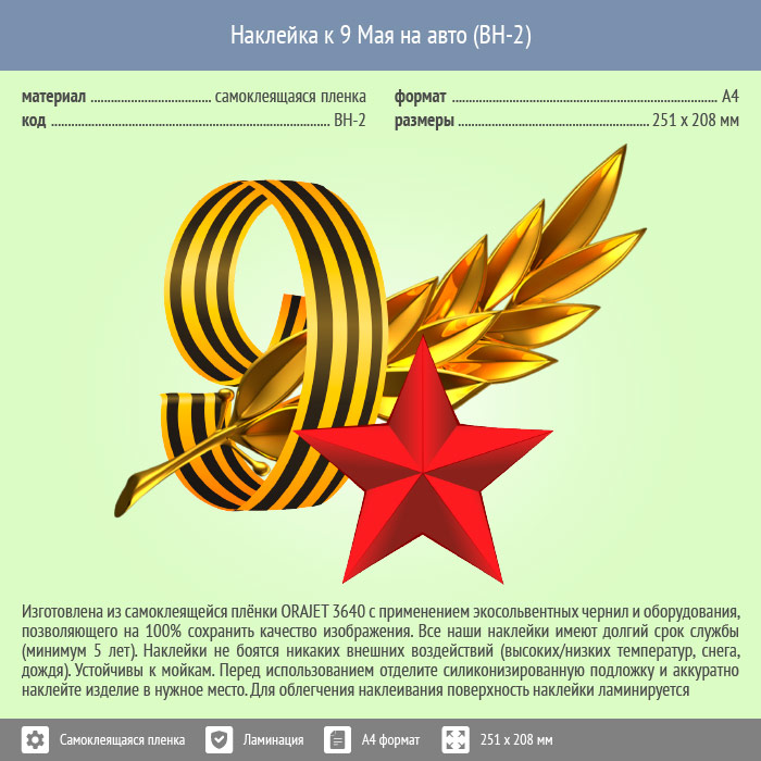 Наклейка к 9 Мая на авто А4 формата (BH-2) в Москве купить