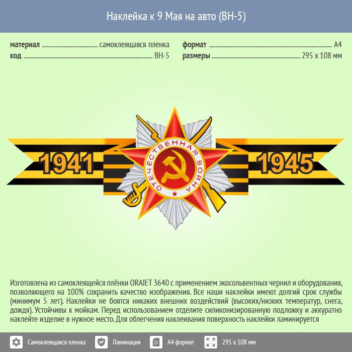 Наклейка к 9 Мая на авто А4 формата (BH-5) в Москве купить