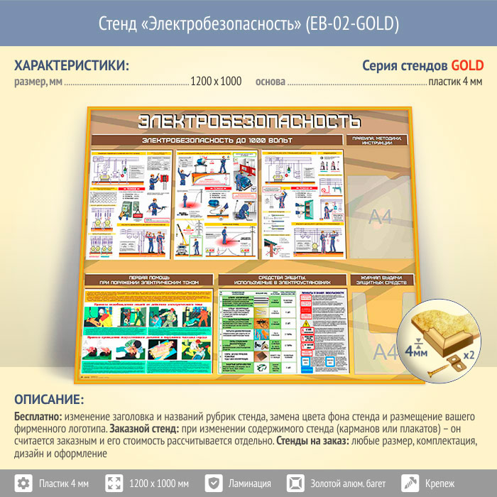 Стенд «Электробезопасность до 1000 вольт» с плоским и объемным карманами (EB-02-GOLD) в Москве купить