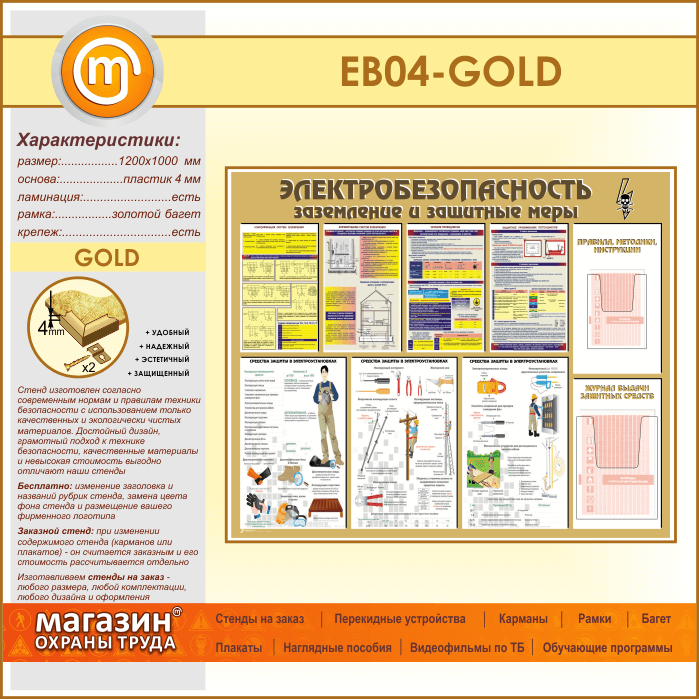 Стенд «Электробезопасность. Заземление и защитные меры» с 2 объемными карманами (EB-04-GOLD) в Москве купить