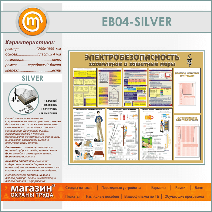 Стенд «Электробезопасность. Заземление и защитные меры» с 2 объемными карманами (EB-04-SILVER) в Москве купить