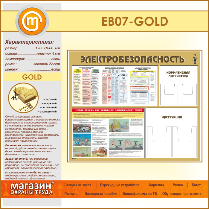 Стенд «Электробезопасность» с 4 объемными карманами (EB-07-GOLD) в Москве купить