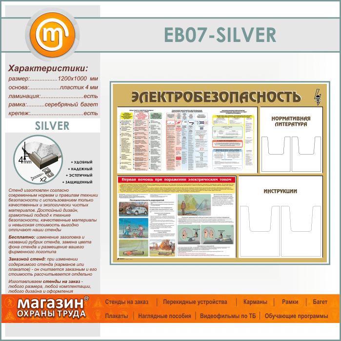 Стенд «Электробезопасность» с 4 объемными карманами (EB-07-SILVER) в Москве купить