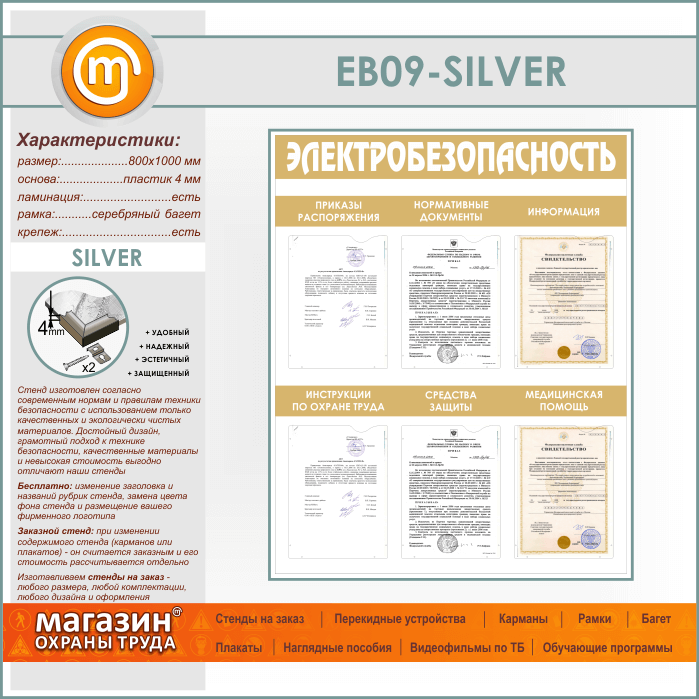 Стенд «Электробезопасность» с 6 карманами (EB-09-SILVER) в Москве купить