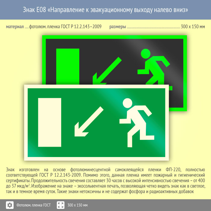Знак E08 «Направление к эвакуационному выходу налево вниз» (фотолюминесцентная пленка ГОСТ 34428-2018, 300х150 мм) в Москве купить