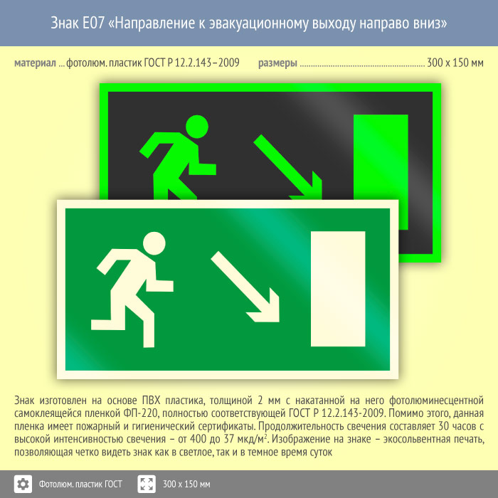 Знак E07 «Направление к эвакуационному выходу направо вниз» (фотолюминесцентный пластик ГОСТ 34428-2018, 300х150 мм) в Москве купить