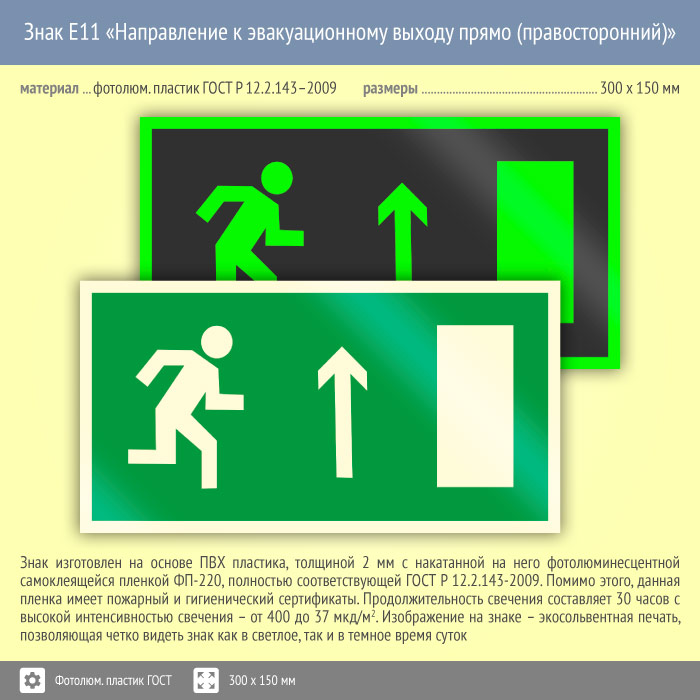 Знак E11 «Направление к эвакуационному выходу прямо (правосторонний)» (фотолюминесцентный пластик ГОСТ 34428-2018, 300х150 мм) в Москве купить