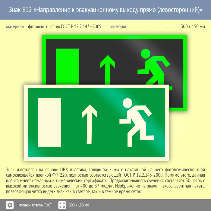 Знак E12 «Направление к эвакуационному выходу прямо (левосторонний)» (фотолюминесцентный пластик ГОСТ 34428-2018, 300х150 мм) в Москве купить
