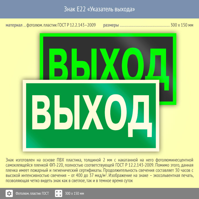 Знак E22 «Указатель выхода» (фотолюминесцентный пластик ГОСТ 34428-2018, 300х150 мм) в Москве купить