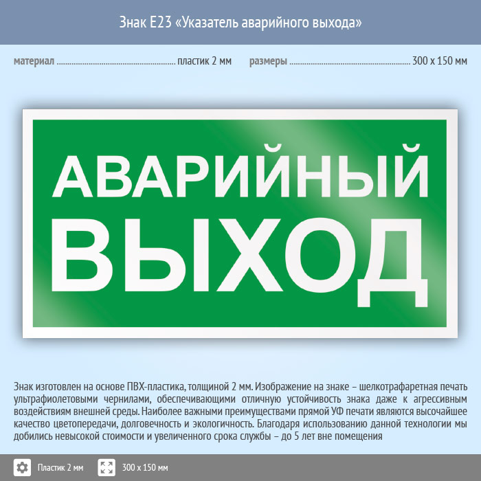 Знак E23 «Указатель аварийного выхода» (пластик, 300х150 мм) в Москве купить