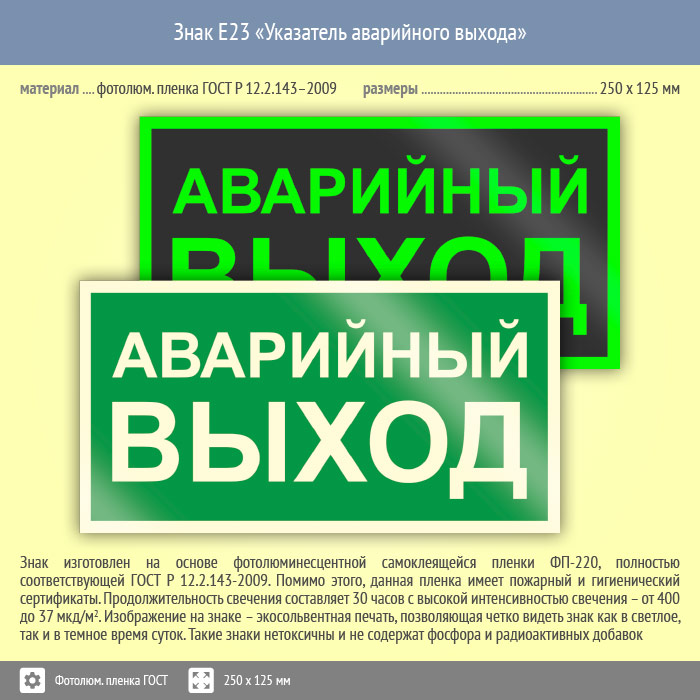 Знак E23 «Указатель аварийного выхода» (фотолюминесцентная пленка ГОСТ 34428-2018, 250х125 мм) в Москве купить
