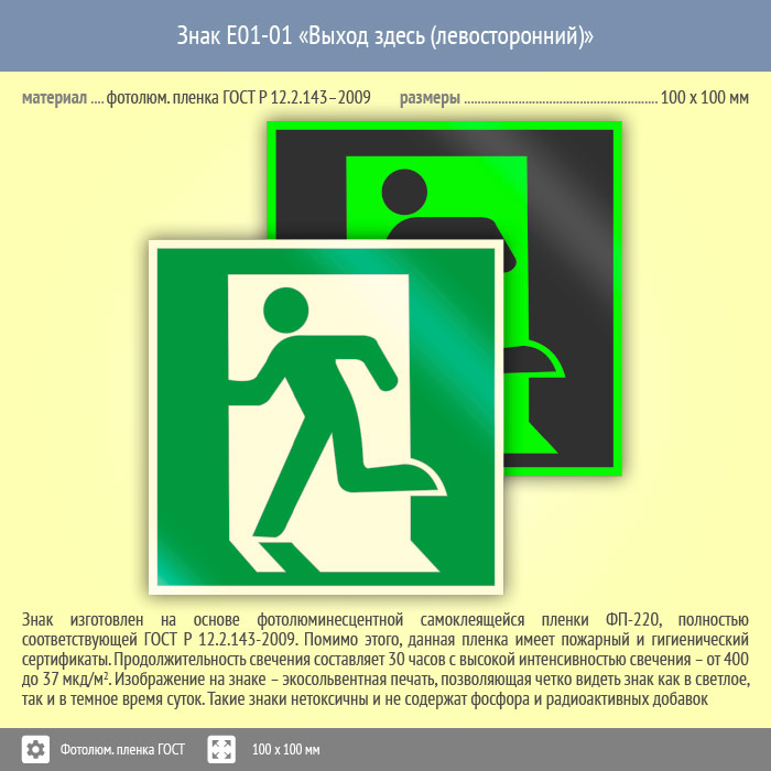 Знак E01-01 «Выход здесь (левосторонний)» (фотолюминесцентная пленка ГОСТ 34428-2018, 100х100 мм) в Москве купить