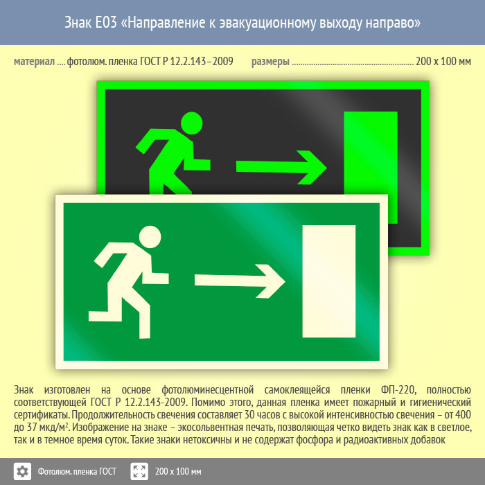 Знак E03 «Направление к эвакуационному выходу направо» (фотолюминесцентная пленка ГОСТ 34428-2018, 200х100 мм) в Москве купить