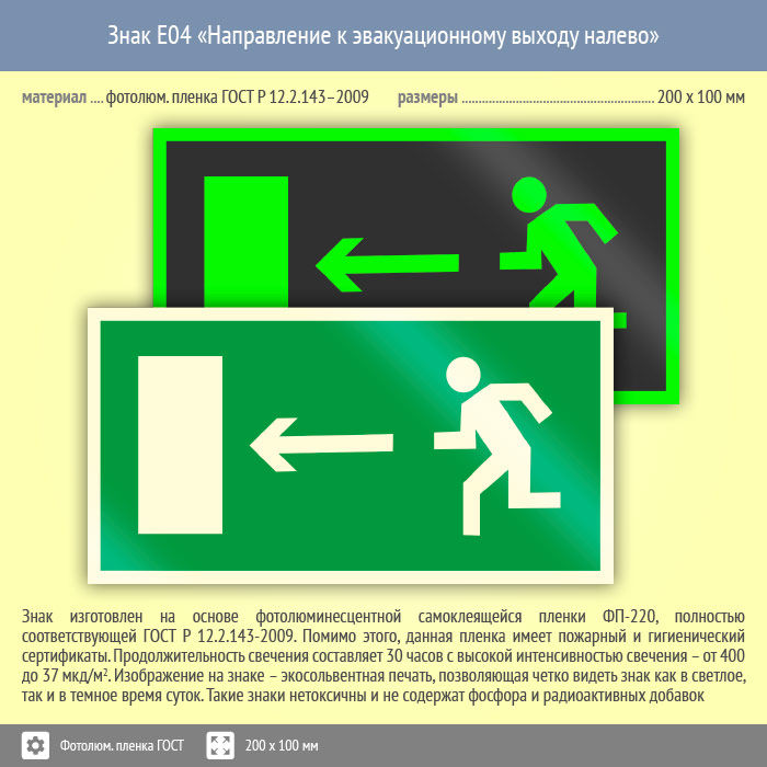 Знак E04 «Направление к эвакуационному выходу налево» (фотолюминесцентная пленка ГОСТ 34428-2018, 200х100 мм) в Москве купить