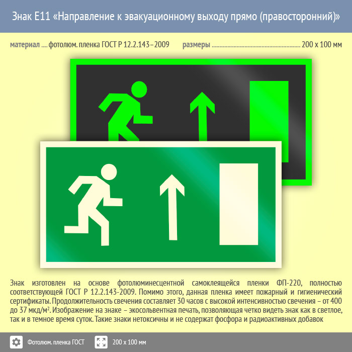 Знак E11 «Направление к эвакуационному выходу прямо (правосторонний)» (фотолюминесцентная пленка ГОСТ 34428-2018, 200х100 мм) в Москве купить