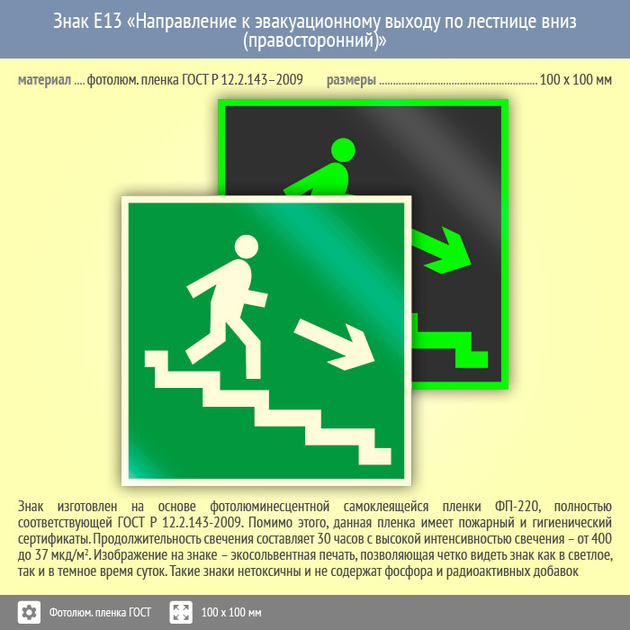 Знак E13 «Направление к эвакуационному выходу по лестнице вниз (правосторонний)» (фотолюминесцентная пленка ГОСТ 34428-2018, 100х100 мм) в Москве купить