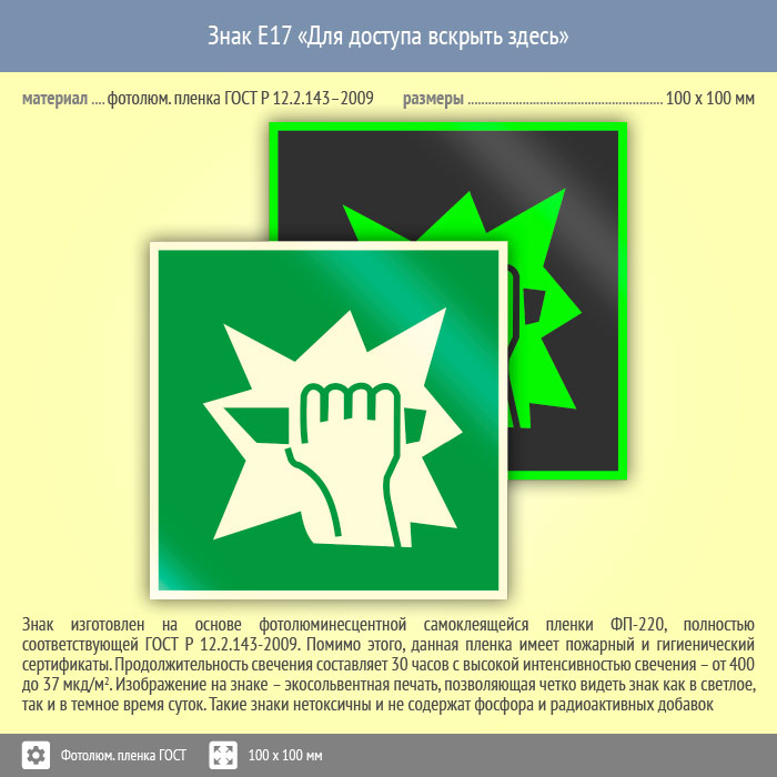 Знак E17 «Для доступа вскрыть здесь» (фотолюминесцентная пленка ГОСТ 34428-2018, 100х100 мм) в Москве купить