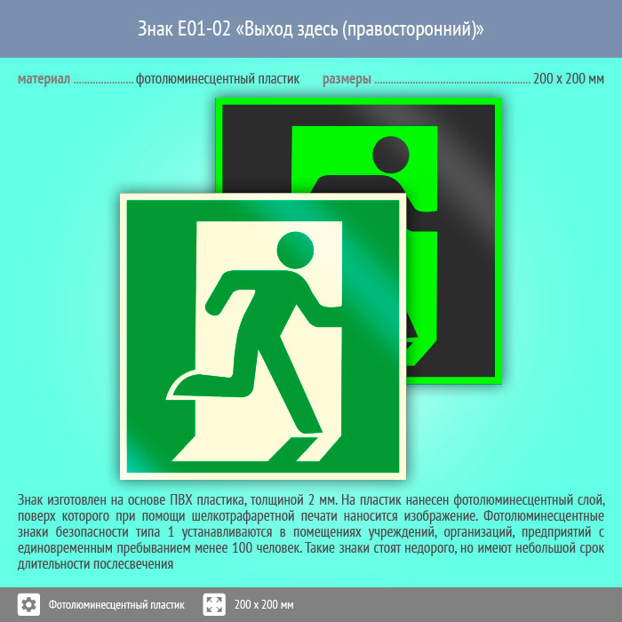 Знак E01-02 «Выход здесь (правосторонний)» (фотолюминесцентный пластик, 200х200 мм) в Москве купить
