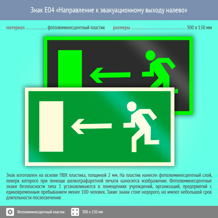 Знак E04 «Направление к эвакуационному выходу налево» (фотолюминесцентный пластик, 300х150 мм) в Москве купить