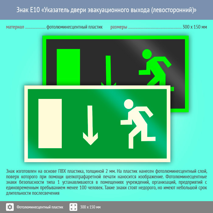Знак E10 «Указатель двери эвакуационного выхода (левосторонний)» (фотолюминесцентный пластик, 300х150 мм) в Москве купить