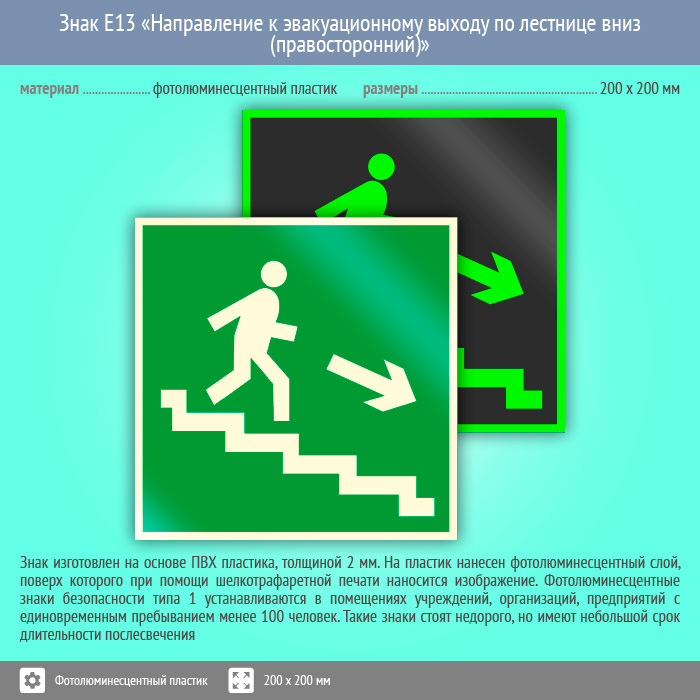 Знак E13 «Направление к эвакуационному выходу по лестнице вниз (правосторонний)» (фотолюминесцентный пластик, 200х200 мм) в Москве купить