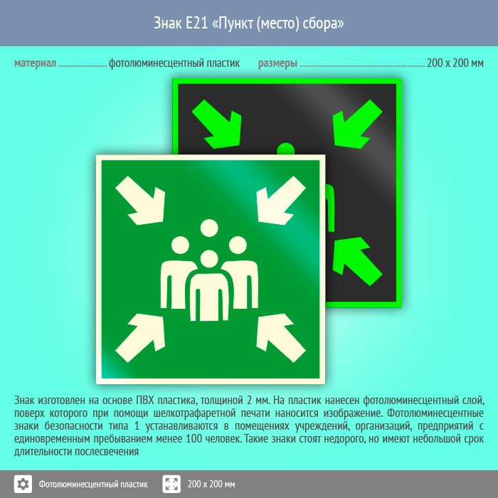 Знак E21 «Пункт (место) сбора» (фотолюминесцентный пластик, 200х200 мм) в Москве купить