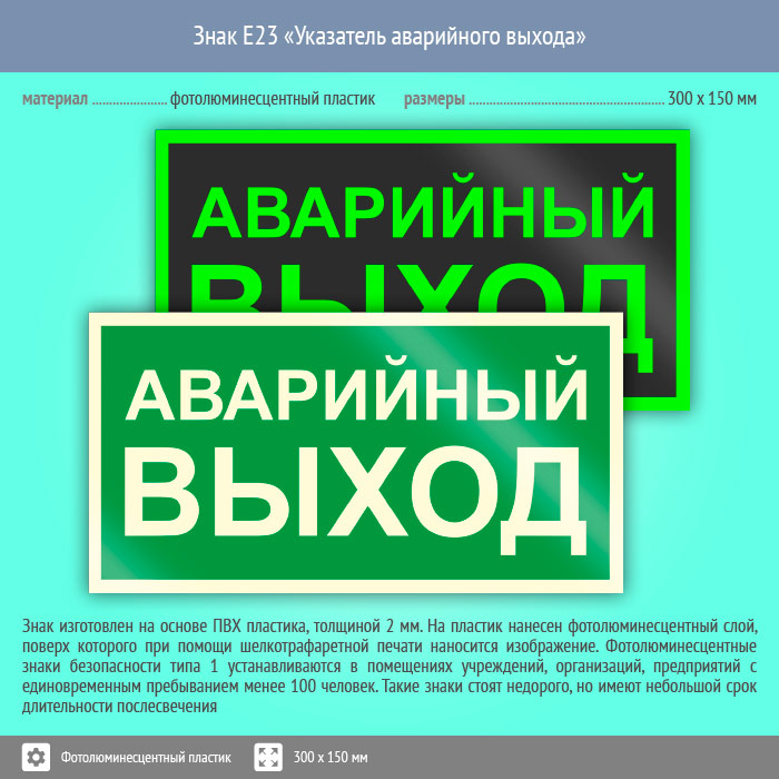 Знак E23 «Указатель аварийного выхода» (фотолюминесцентный пластик, 300х150 мм) в Москве купить
