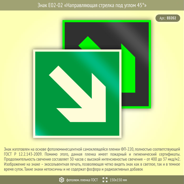 Знак E02-02 «Направляющая стрелка под углом 45°» (фотолюминесцентная пленка ГОСТ 34428-2018, 150х150 мм) в Москве купить