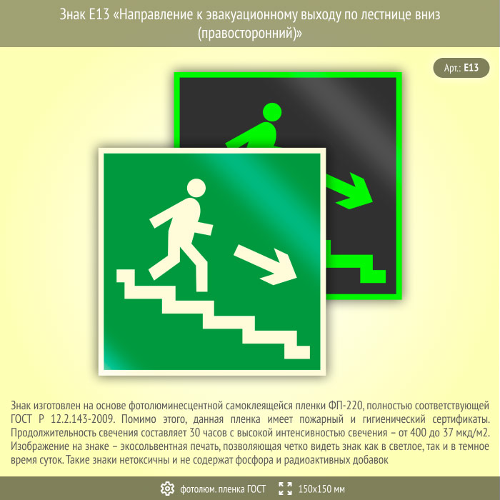 Знак E13 «Направление к эвакуационному выходу по лестнице вниз (правосторонний)» (фотолюминесцентная пленка ГОСТ 34428-2018, 150х150 мм) в Москве купить