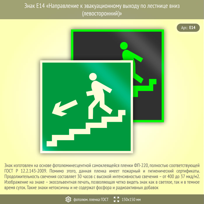 Знак E14 «Направление к эвакуационному выходу по лестнице вниз (левосторонний)» (фотолюминесцентная пленка ГОСТ 34428-2018, 150х150 мм) в Москве купить