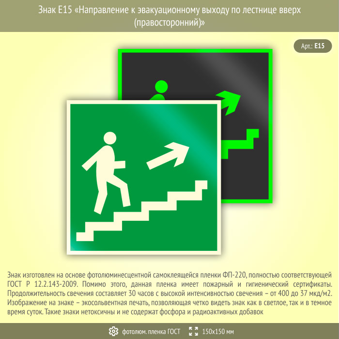 Знак E15 «Направление к эвакуационному выходу по лестнице вверх (правосторонний)» (фотолюминесцентная пленка ГОСТ 34428-2018, 150х150 мм) в Москве купить
