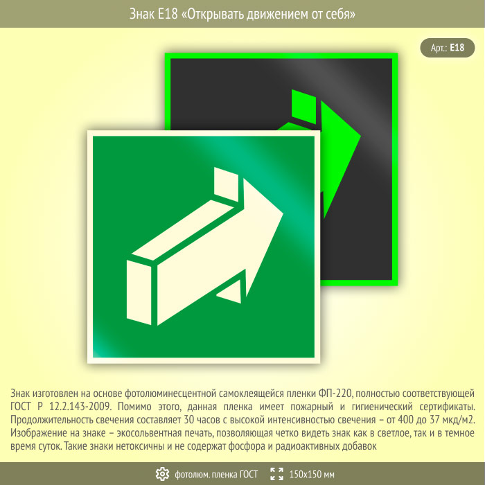 Знак E18 «Открывать движением от себя» (фотолюминесцентная пленка ГОСТ 34428-2018, 150х150 мм) в Москве купить