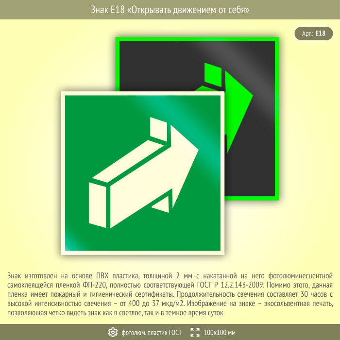 Знак E18 «Открывать движением от себя» (фотолюминесцентный пластик ГОСТ 34428-2018, 100х100 мм) в Москве купить
